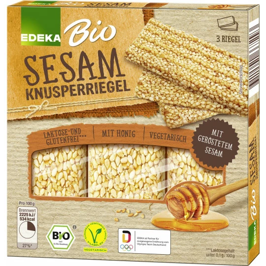 Zutatenverzeichnis: 53% SESAM*, Maltosesirup*, Rohrzucker*, 5% Honig*. *aus kontrolliert ökologischer Landwirtschaft Das Produkt kann Spuren von ERDNÜSSEN und SCHALENFRÜCHTEN enthalten.