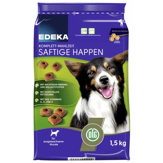 Zutatenverzeichnis: Getreide, Fleisch und tierische Nebenerzeugnisse (u.A. 4% Rind), pfanzliche Nebenerzeugnisse, Zucker, Öle und Fette, Gemüse (4% Karotten)